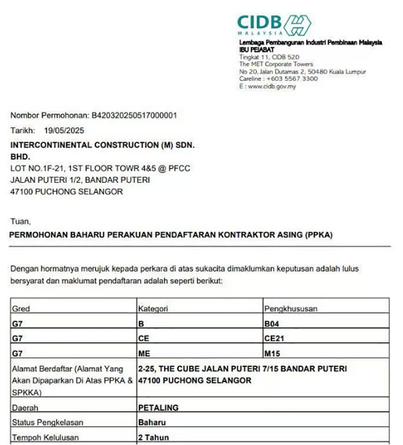 近日,經(jīng)馬來西亞建筑工業(yè)發(fā)展局(CIDB)批準(zhǔn),合景建設(shè)集團(tuán)有限公司全資子公司洲際建設(shè)(馬來西亞)有限公司取得馬來西亞最高等級(jí)G7承包商資質(zhì),包括土木工程(CE21)、土建工程(B04)、機(jī)電工程(M15)以及各種機(jī)械工程等多項(xiàng)內(nèi)容。這是合景建設(shè)在馬來西亞建筑資質(zhì)領(lǐng)域的重大突破,意味著公司在智慧建筑領(lǐng)域的技術(shù)實(shí)力、屬地化服務(wù)能力及行業(yè)影響力獲官方權(quán)威認(rèn)可。